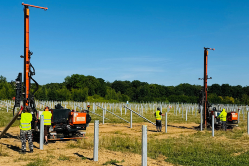 Bis zu zwei Rammgeräte schlagen täglich rund 650 Pfosten ein. Am Ende werden es 6341 Stück sein, die die Unterkonstruktion für die 21 800 Photovoltaik-Module tragen. Insgesamt werden 120 Kilometer Kabel verlegt.